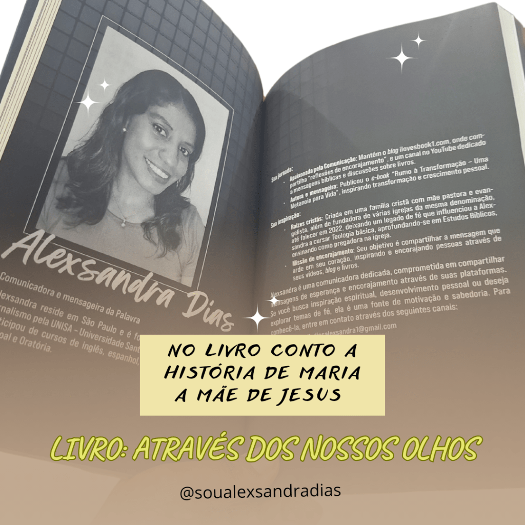 No meu capítulo, conto a história de Maria, a mãe de Jesus, sob a minha perspectiva. Mas não se engane: não é apenas mais uma narrativa religiosa. Em “Através dos Nossos Olhos”, apresento a extraordinária trajetória de Maria de uma maneira única e envolvente. Você vai descobrir aspectos que talvez ainda não conheça sobre essa figura tão icônica!